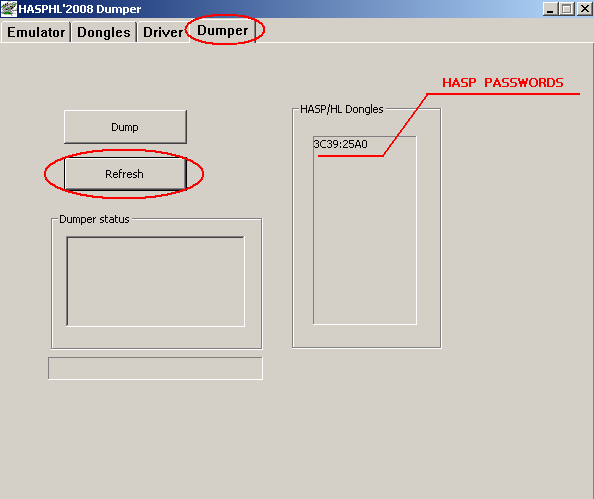 hasp" or something alike. This is normal and fully ok for us. During this time HASPHL2008.exe will capture and log the password pairs for us. 7. Now go back to HASPHL2008.exe, select "Dumper" tab and press "Refresh". If all ok you will see the passwords - pair of hexadecimal numbers. Great - half work done. It could be you will see more than one pair. Write down all pairs. We will need them.